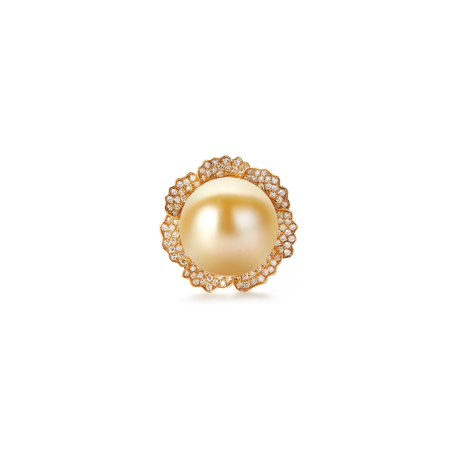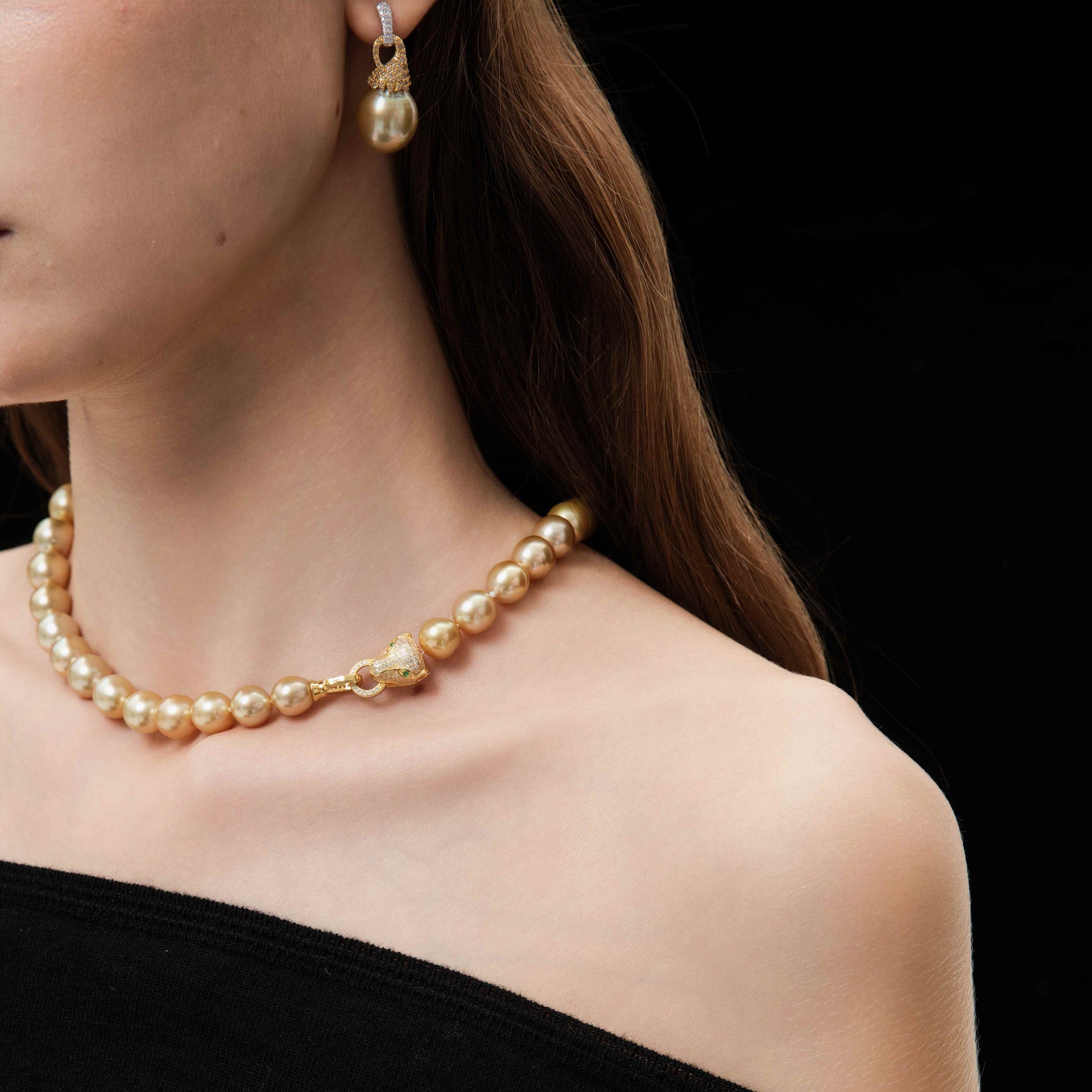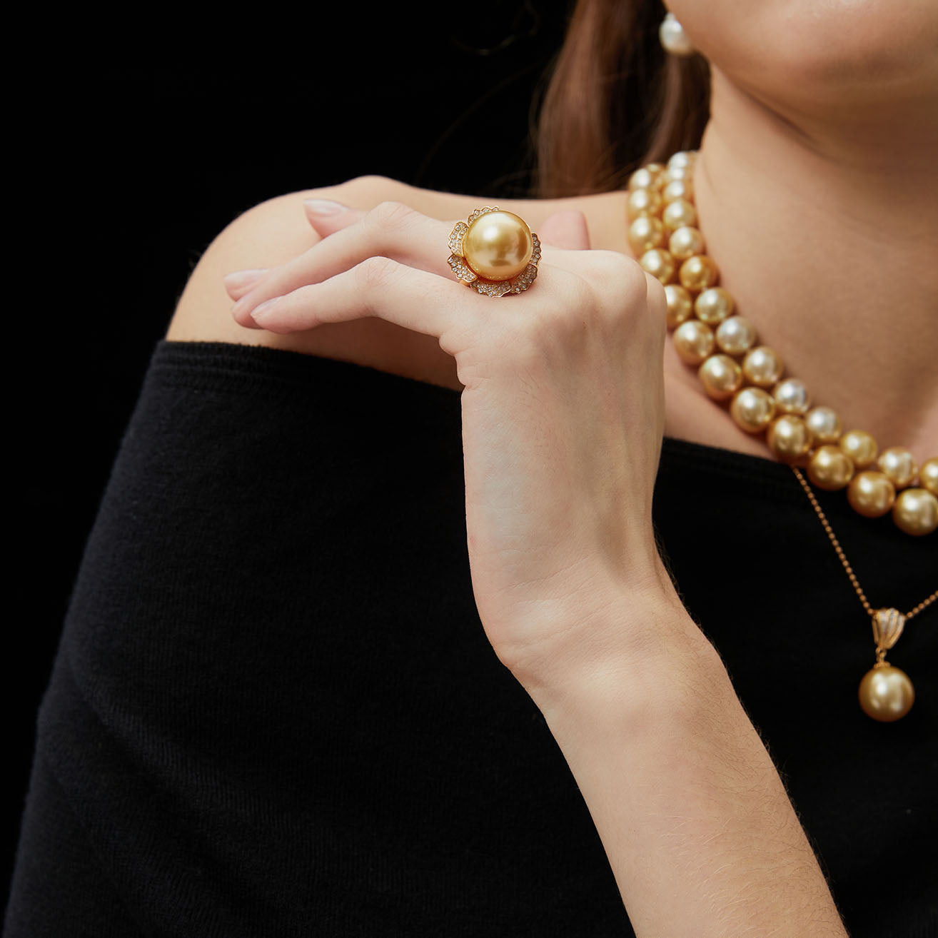 This 18k gold ring includes a neutral golden, true round pearl, measured between 15.5-16mm, with very high luster. This 18k gold necklace includes neutral golden, true round pearls, each measured between 12-13mm, with very high luster.