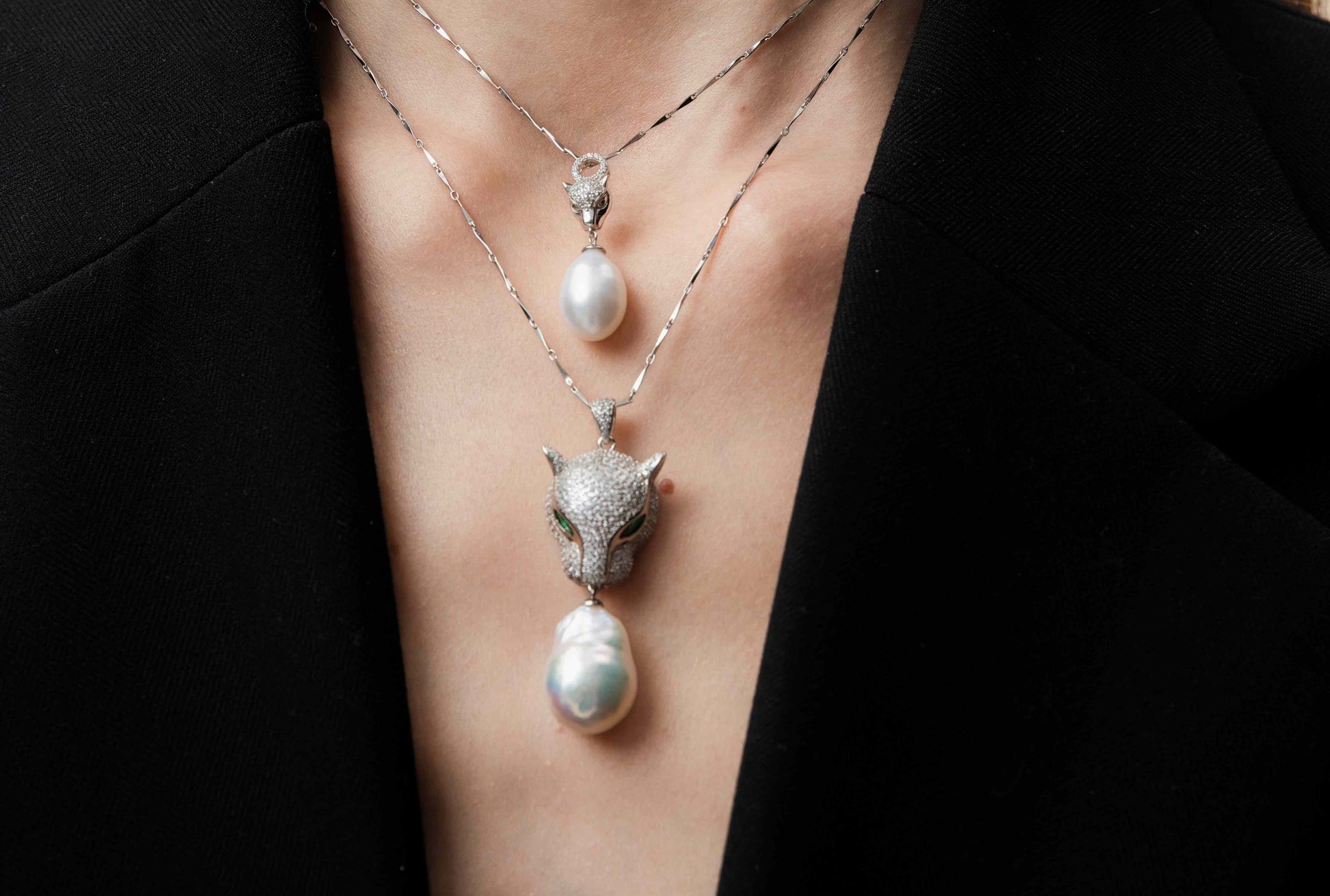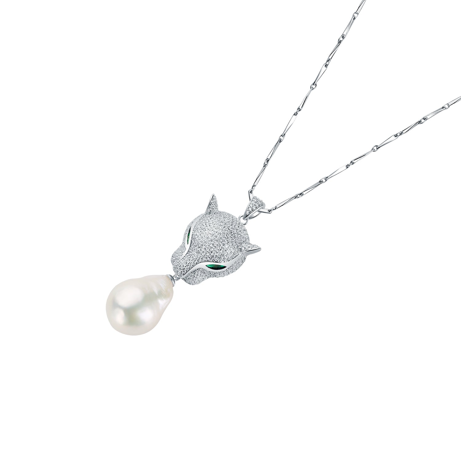 This pendant includes a white baroque pearl, measured between 18-29mm, with very high luster.