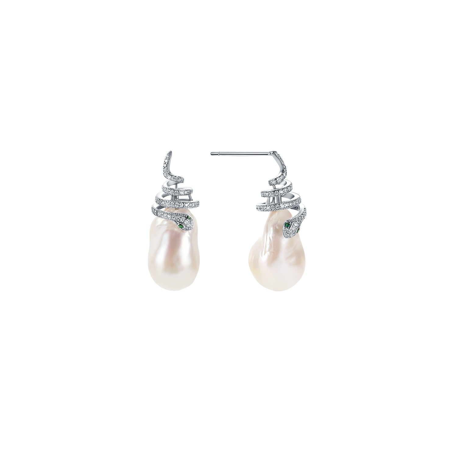 Each earring includes a white baroque pearl, measured between 15-22mm, with very high luster.