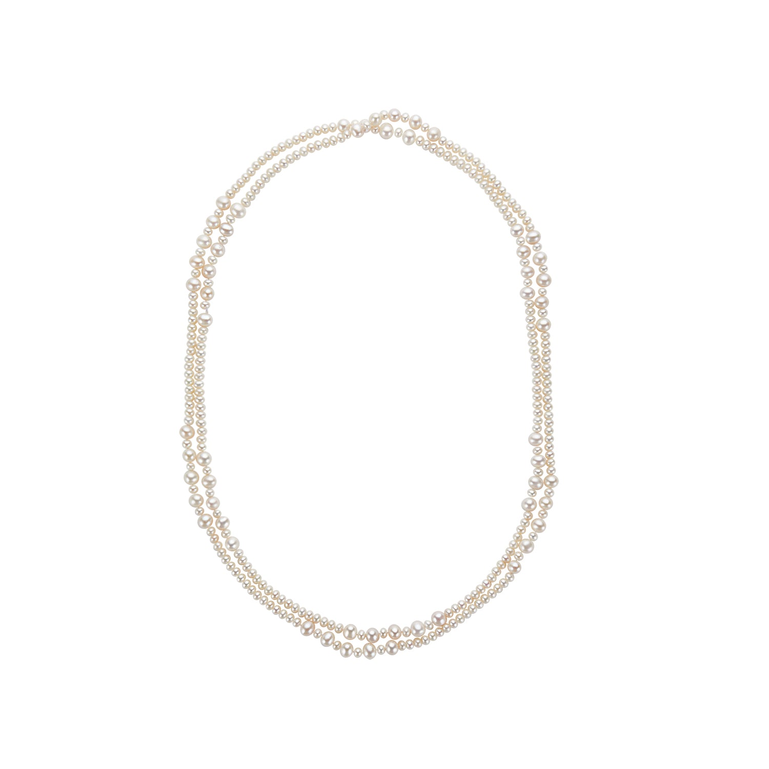 This 1.6m length, hand-threaded necklace includes white near-round pearls, measured between 5-10mm, with high luster.